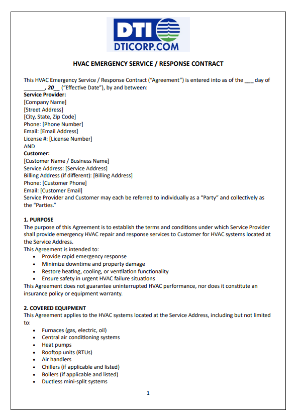– HVAC Emergency Service/Response Contract: Guarantees a specific, rapid response time (e.g., 2-4 hours) for critical system failures, crucial for businesses.