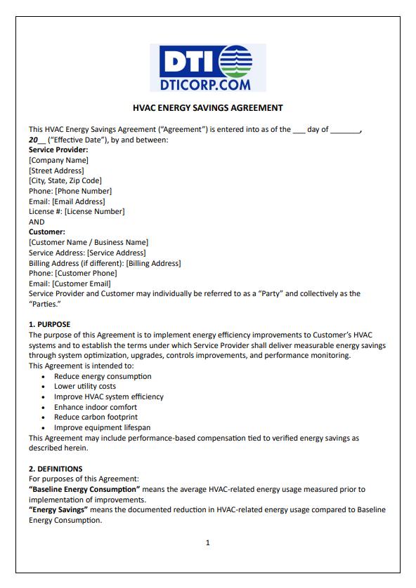 – HVAC Energy Savings Agreement (ESA): Focuses on optimizing system performance, often guaranteeing a specific energy reduction or ROI.