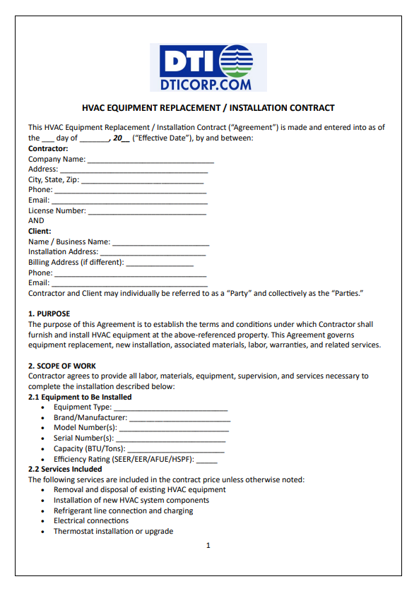 – HVAC Equipment Replacement/Installation Contract: Outlines scope, costs, and warranties for installing new systems, ensuring compliance and performance standards.