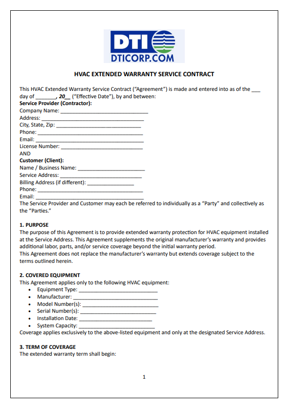 – HVAC Extended Warranty Service Contract: Extends manufacturer coverage for major components (compressors, motors), often bundled with maintenance.