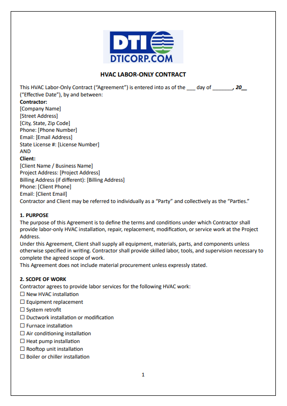 – HVAC Labor-Only Contract: Covers the cost of technicians for inspections and repairs, while the client pays for parts, often used for older equipment.