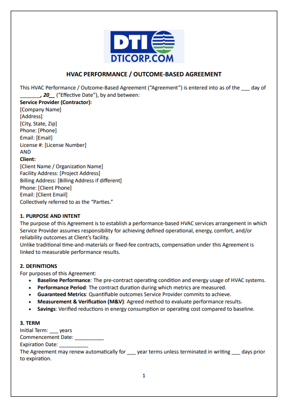 – HVAC Performance/Outcome-Based Contract: Ties payment to specific outcomes, such as maintaining a set, comfortable temperature range in a building.