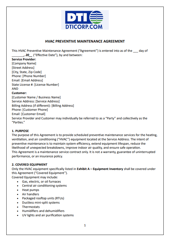 – HVAC Preventive Maintenance Contract (PM Contract): The most common contract, detailing scheduled inspection, cleaning, and filter changes to prevent equipment failure.