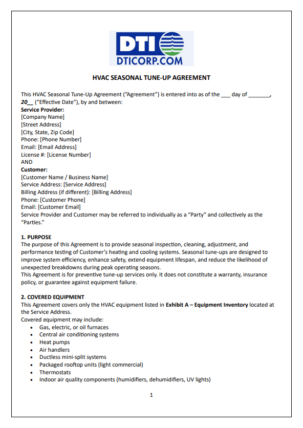 – HVAC Seasonal Tune-Up Agreement: Specialized, semi-annual agreements (fall/spring) designed to prepare systems for extreme weather, enhancing efficiency.