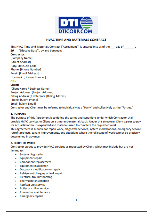 – HVAC Time-and-Materials (T&M) Contract: Common for repair-based work where the contractor is paid for actual hours worked and materials used.